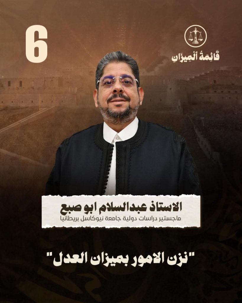 أ. عبدالسلام يونس أبوصبع – عميد قائمة الميزان و مرشّح بلدية سبها ماجستير دراسات دولية وعلوم سياسية – جامعة نيوكاسل / بريطانيا (1999)
